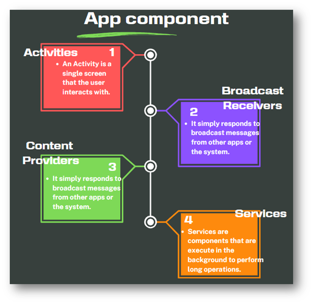 In Android development, there are four main components that are essential in creating an app.