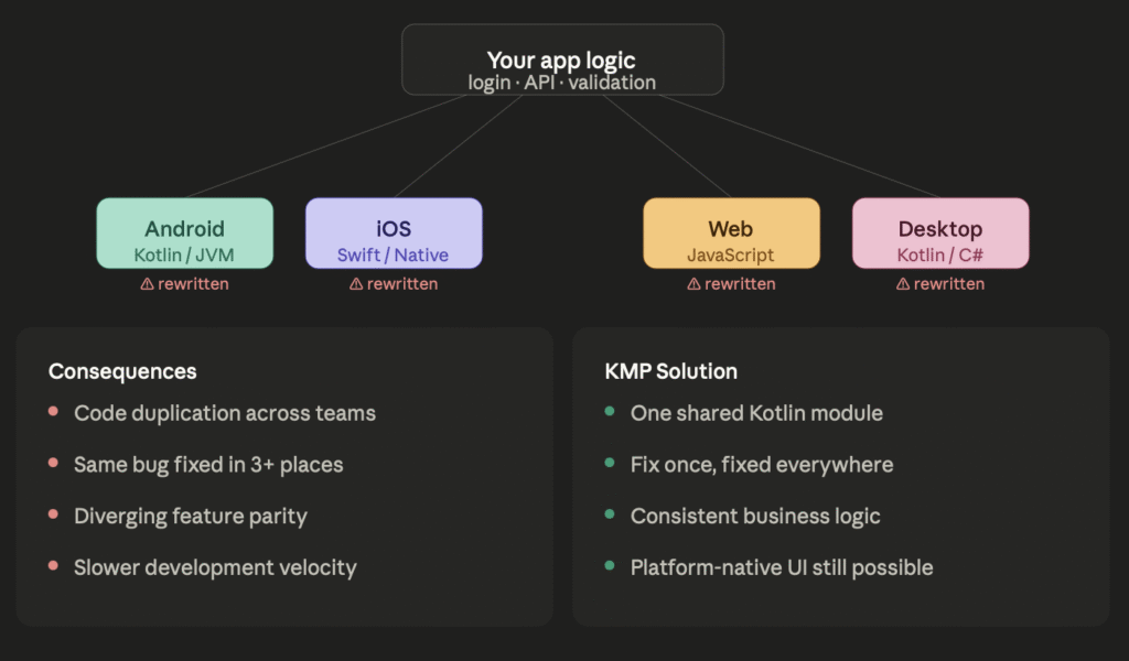 Each platform has its own language, UI framework, and runtime. Even identical logic (login, API calls, validation) must be rewritten per platform.