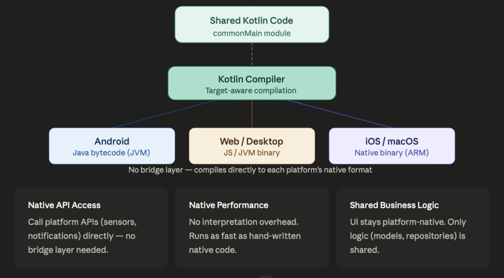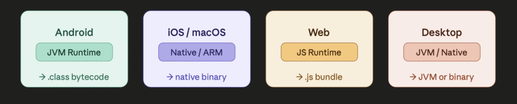 The Kotlin compiler targets each platform separately — no single universal binary. It generates exactly the right output for each target.