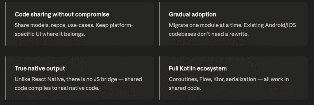 - Native Integration: Because KMP targets the native format of each OS (e.g., Java bytecode for the JVMon Android and native binaries for iOS), you can call platform-specific system APIs (like hardware sensors or notifications) directly from your shared Kotlin code .