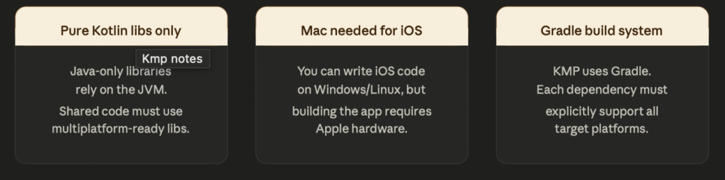 - Library Constraints : You are restricted to using pure Kotlin libraries within your shared code. Libraries written in Java cannot be used in the shared module because they often rely on the JVM (Java Virtual Machine), which is not available on non-JVM platforms like iOS.