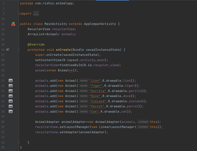 Let’s take a look at an example for RecyclerViewthrough making small animal app.