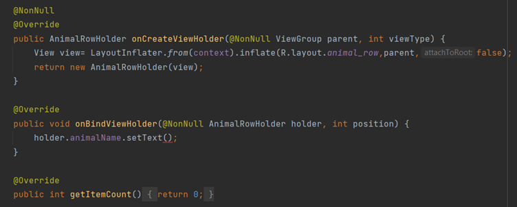 Now In AnimalAdapter implement the method by autocompletion those are onCreateViewHolder,onBindViewHolder,getItemCount.