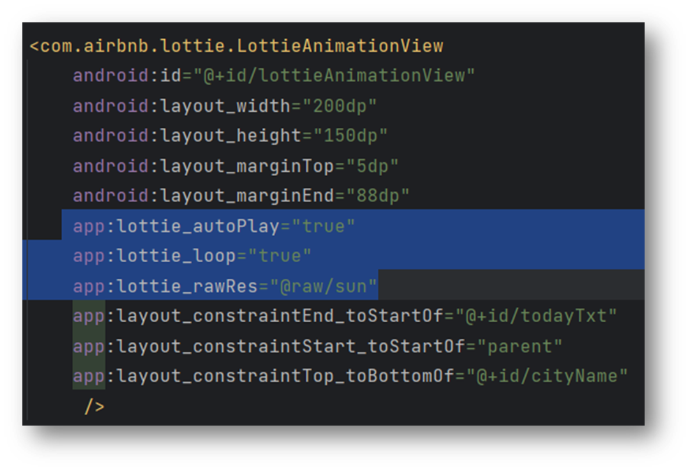 Instead of using a static icon, we will use AnimationView to display the weather conditions. This will enhance the user experience. To implement animated views, we are using the Lottie library.